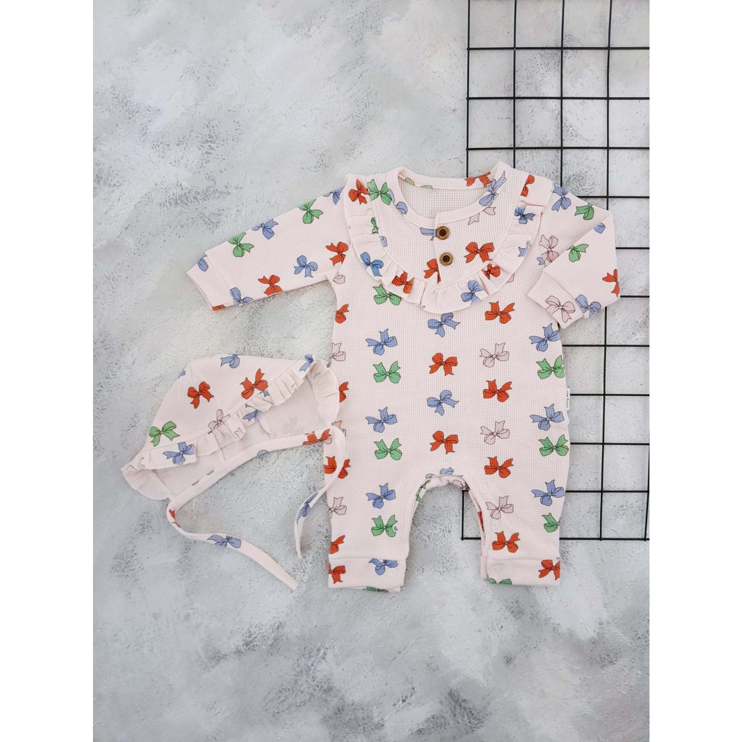 BABYMİİ 0240 FİYONK BASKILI LORA ŞAPKALI TULUM - SOMON - 9-12 AY