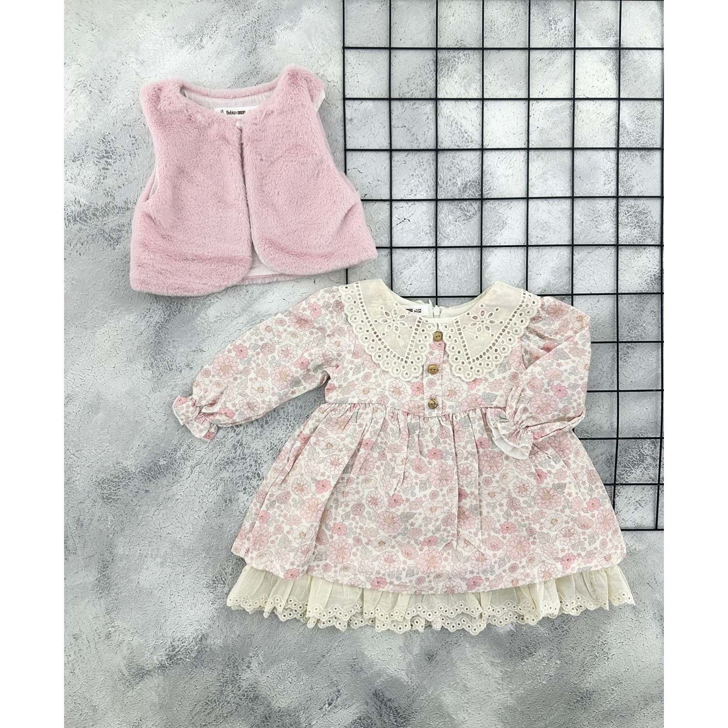 BEBİÇO 5433 PELUŞ YELEKLİ ÇİÇEKLİ ELBİSE - PEMBE - 6-9 AY