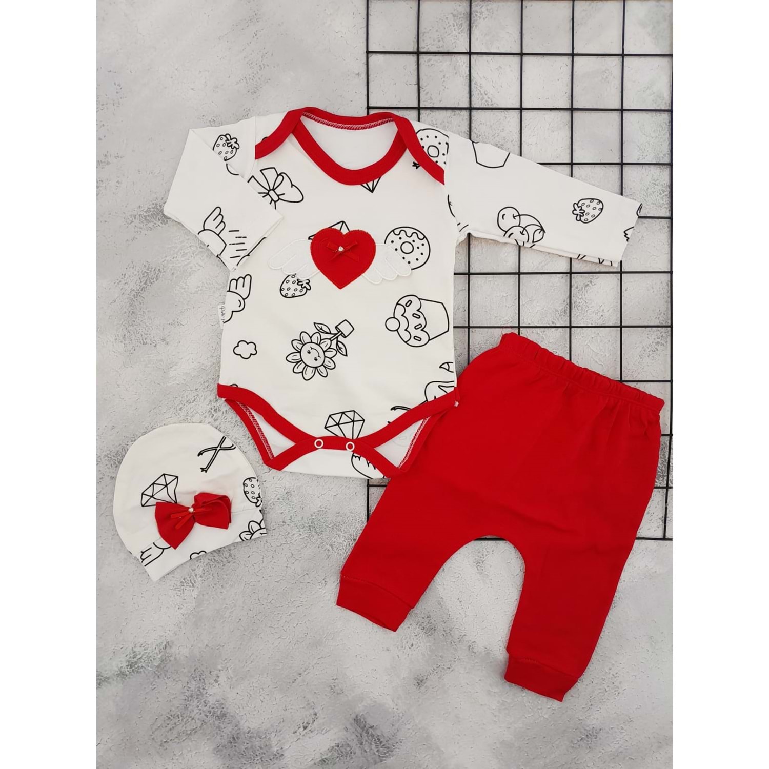 NİKUBY 1755 KANATLI KALP NAKIŞLI BADİ TAKIM - KIRMIZI - 6-9 AY