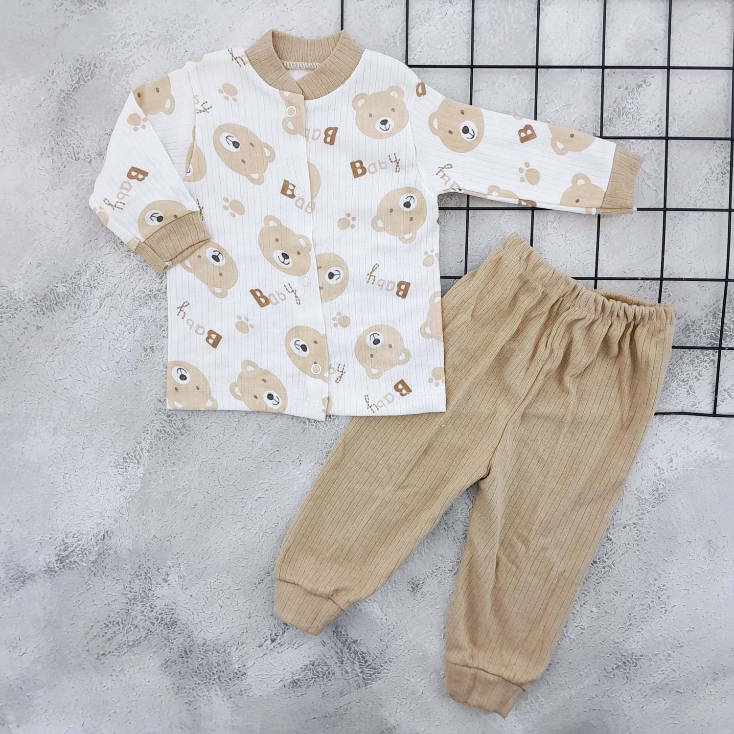 GONCA 051 YAKASI BİYELİ SEVİMLİ AYICIK PİJAMA TAKIM - KAHVE - 0-6 AY