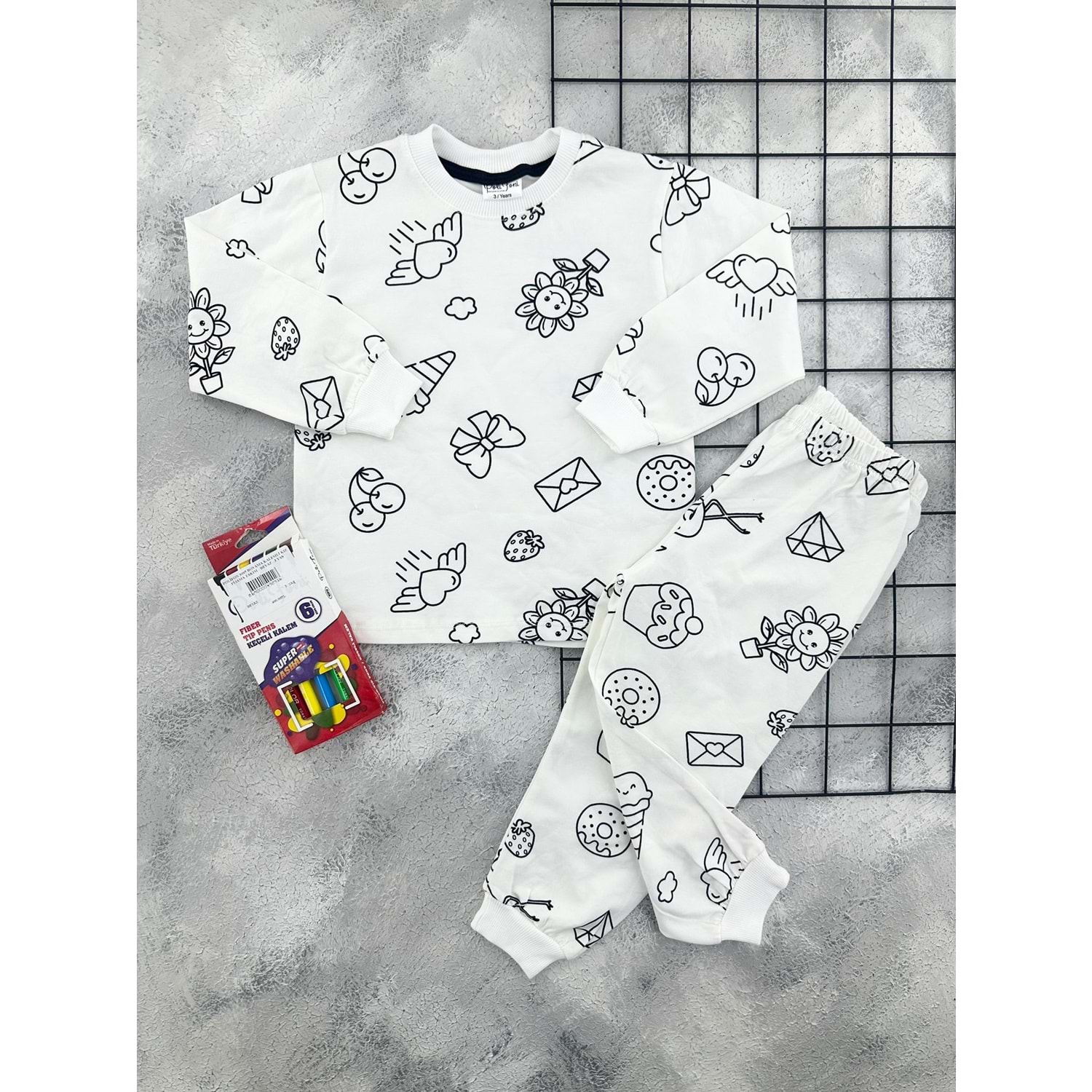 POLİFON 3095 BOYAMA KALEMLİ KIZ PİJAMA TAKIM - BEYAZ - 3 YAŞ